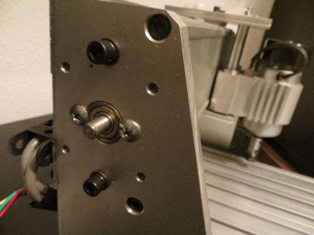 Then I used another smaller Alan key to tighten the collars onto the lead screws. I was able to then verify this moved by turning the knobs at the end of the steppers. I plugged the cables into the steppers and the spindle, using the handy cable guides at the top of the z axis to stop the spindle cable getting in the way of X axis movements.